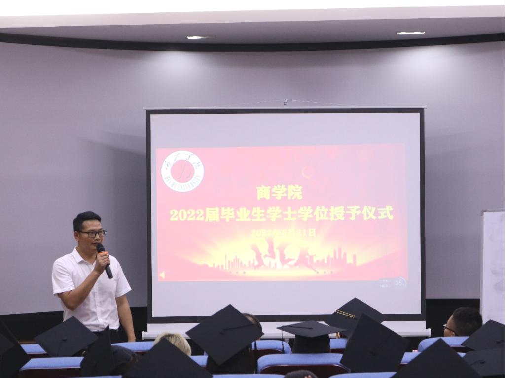 yl6809永利官网2022届毕业典礼于6月21日在弘毅楼3-504报告厅顺利举行。永利官网党委书记韦书觉,院长覃举东,党委副书记蓝振榕,各教研室主任以及辅导员出席本次典礼。典礼由蓝振榕主持。